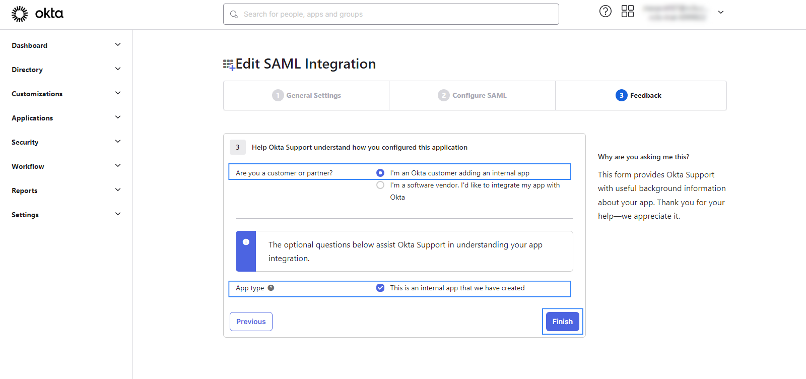 Note the necessary parameters from the SAML settings of the new app. The parameters already obtained during the integration are: