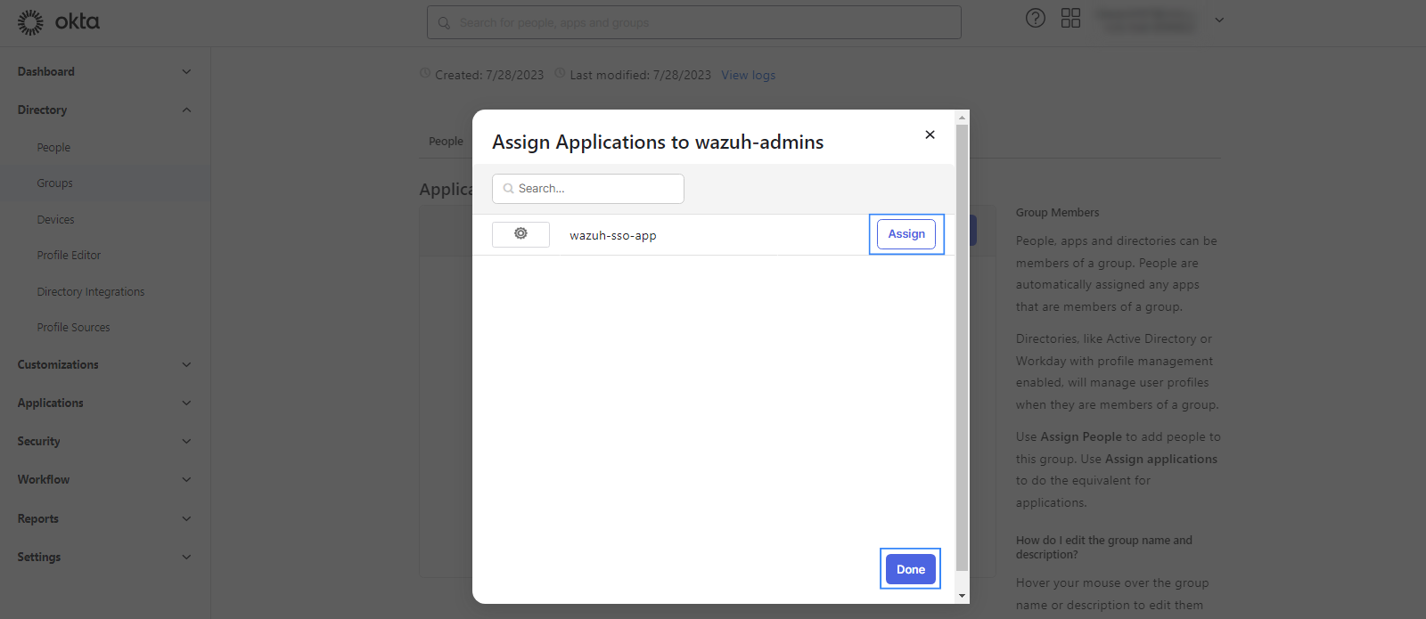 Add the new app to the new group. Navigate to Directory > Groups and select your group. Click on Applications and select Assign Applications. From here, assign the app created in step 5 and click on Done to save the changes.