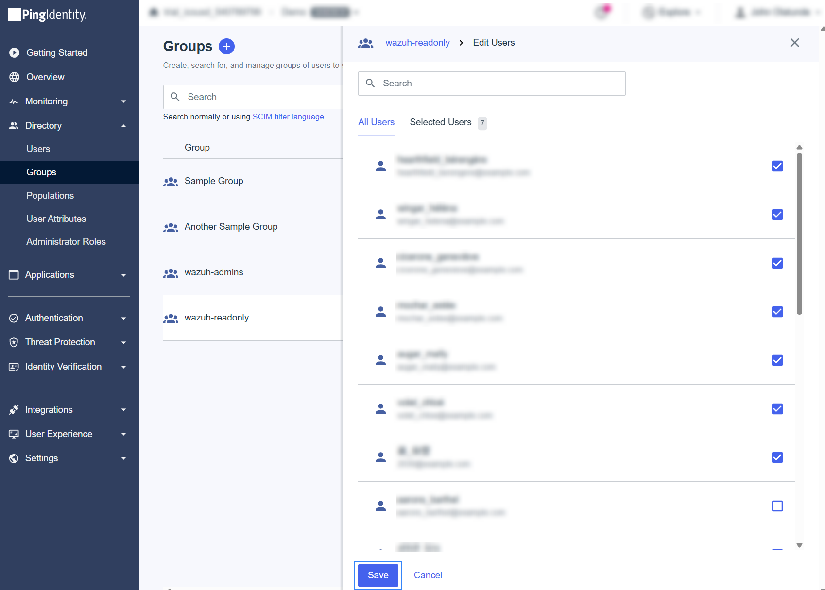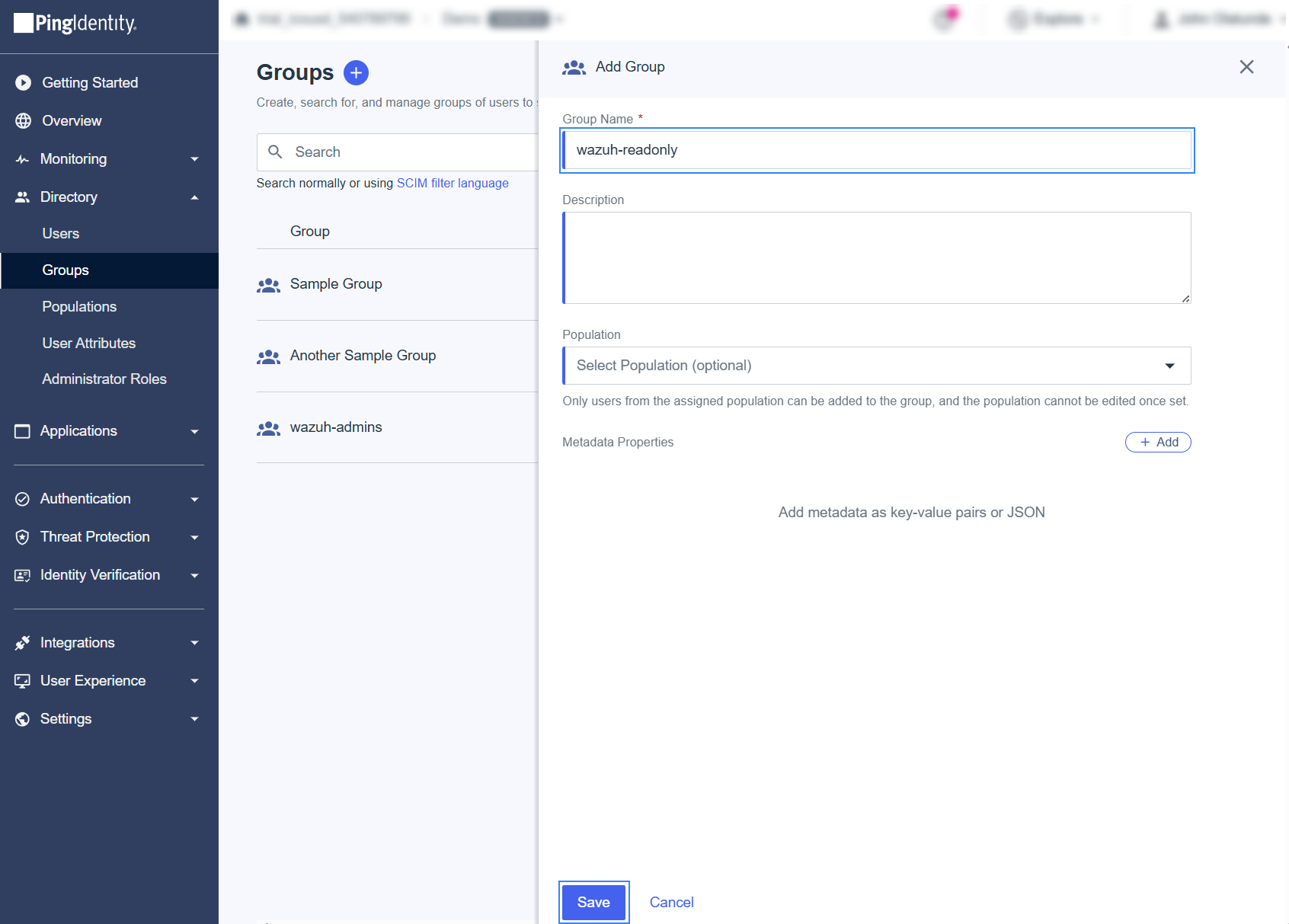 Follow these steps to integrate PingOne IdP with Wazuh for single sign-on and grant read-only role to the authenticated PingOne users on the Wazuh platform: