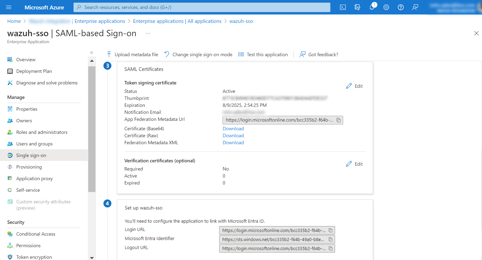 idp.metadata_urlin the Wazuh indexer configuration file.In option 4 Set up <YOUR APPLICATION>, the Microsoft Entra ID Identifier will be our