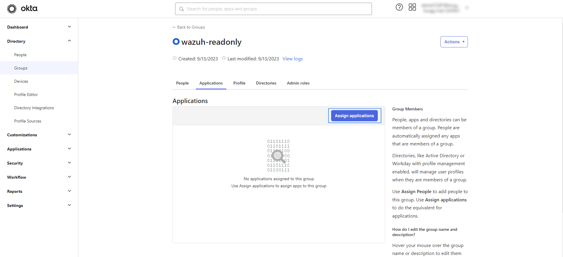 wazuh-readonly. This name will be used as ourbackend_rolesinroles_mapping.yml.Add the new user to the new group. Navigate to Directory > Groups and select your group. Click on Assign People and add the user to the group created.