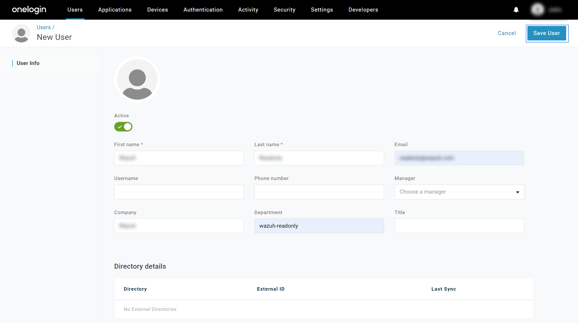 Complete the mandatory fields, assign a value in the Department field and click on Save User. In our case, the department is