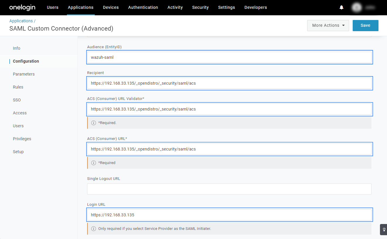 Wazuh. Navigate to the Configuration tab and fill in the information:Audience (EntityID):