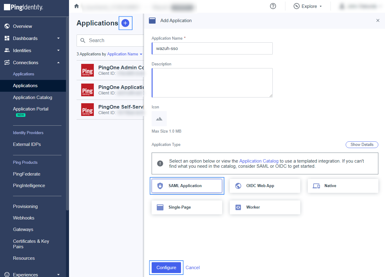 wazuh-sso.Proceed to the Choose Application Type section, and select SAML Application > Configure.