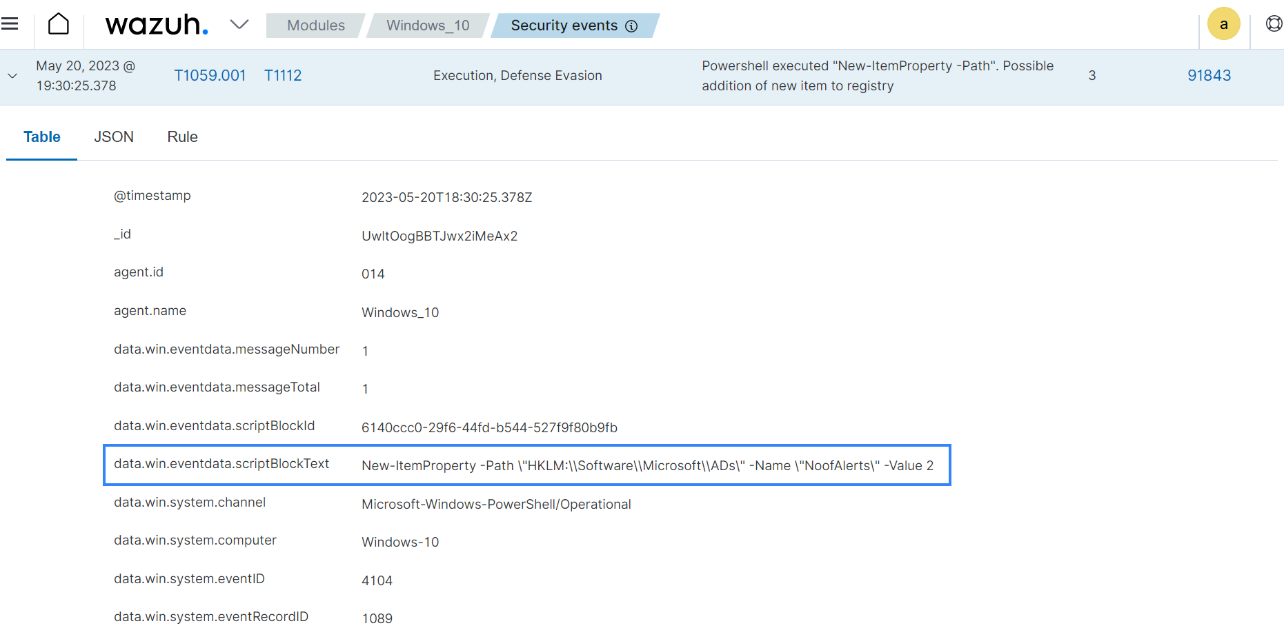 Wazuh has a built-in rule 91843 to detect when a PowerShell adds a new Windows registry key. You can view this rule in the /var/ossec/ruleset/rules/0915-win-powershell_rules.xml file on the Wazuh server:
