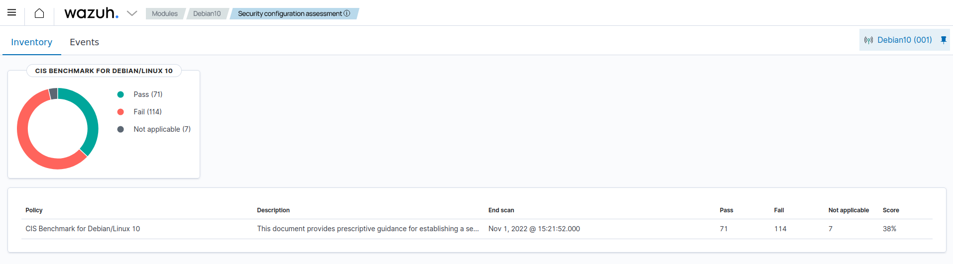 You can view the scan summaries on the Security configuration assessment tab on the Wazuh dashboard.